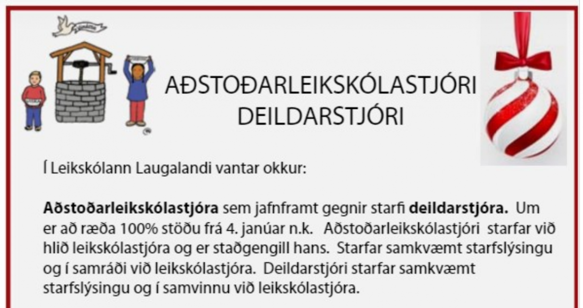 Aðstoðarleikskólastjóra sem jafnframt gegnir starfi deildarstjóra. Um er að ræða 100% stöðu frá 4. janúar n.k. Aðstoðarleikskólastjóri starfar við hlið leikskólastjóra og er staðgengill hans. Starfar samkvæmt starfslýsingu og í samráði við leikskólastjóra. Deildarstjóri starfar samkvæmt starfslýsingu og í samvinnu við leikskólastjóra.