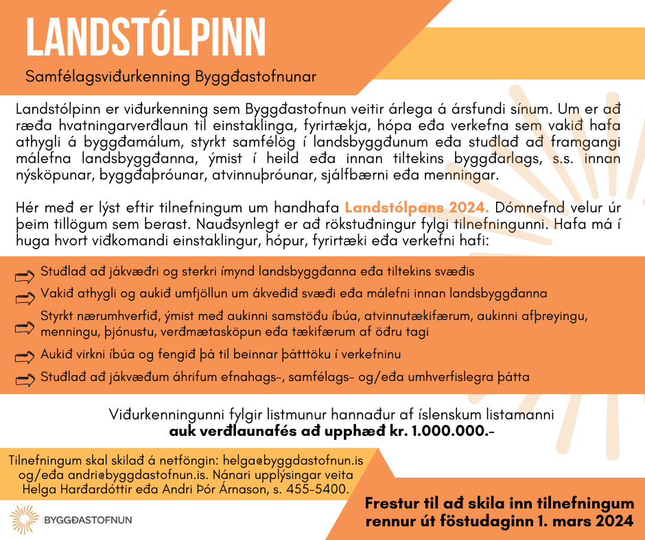 Hér með er lýst eftir tilnefningum um handhafa Landstólpans 2024. Dómnefnd velur úr þeim tillögum sem berast.