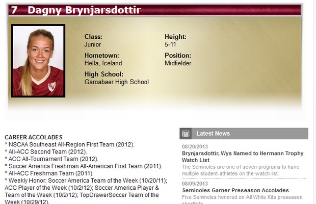Sjá hér frétt á www.seminoles.com: http://www.seminoles.com/sports/w-soccer/spec-rel/082013aaa.html