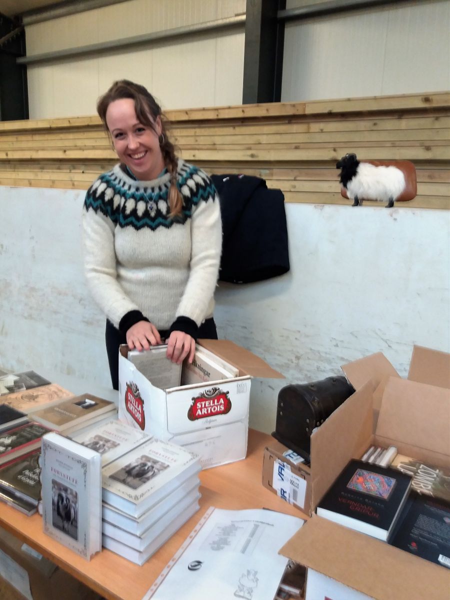 Harpa Rún Kristjánsdóttir með sölubás frá Bókakaffi Bjarna Harðarsonar.