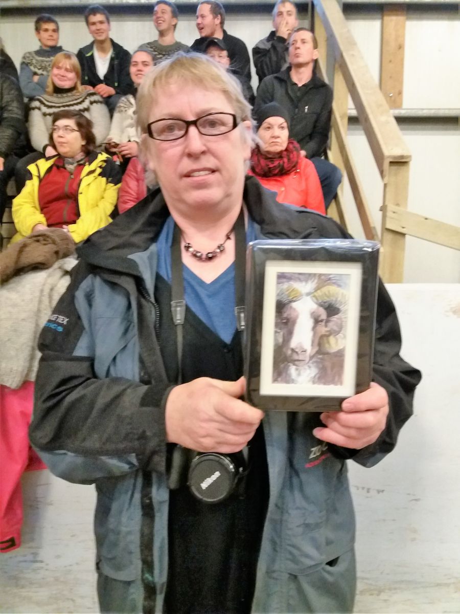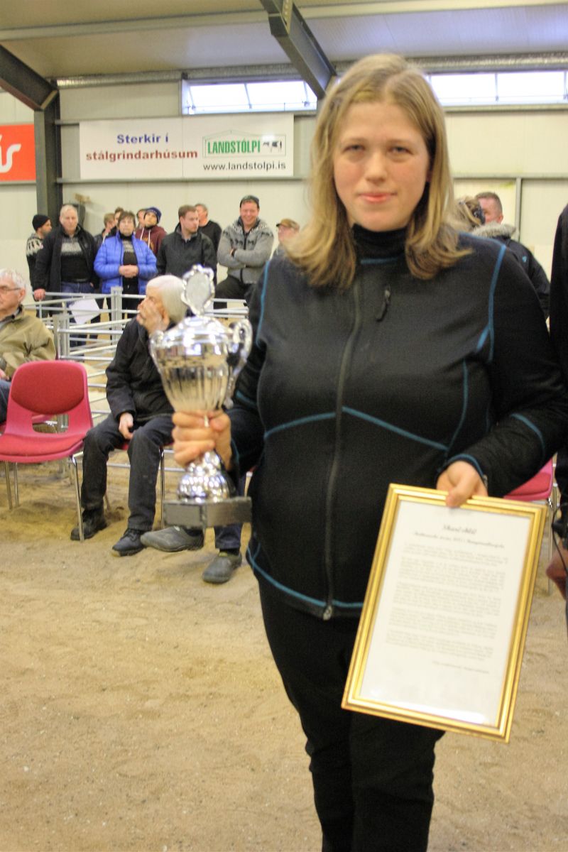 Ásta á Grjótá með verðlaun fyrit litfegursta lambið.