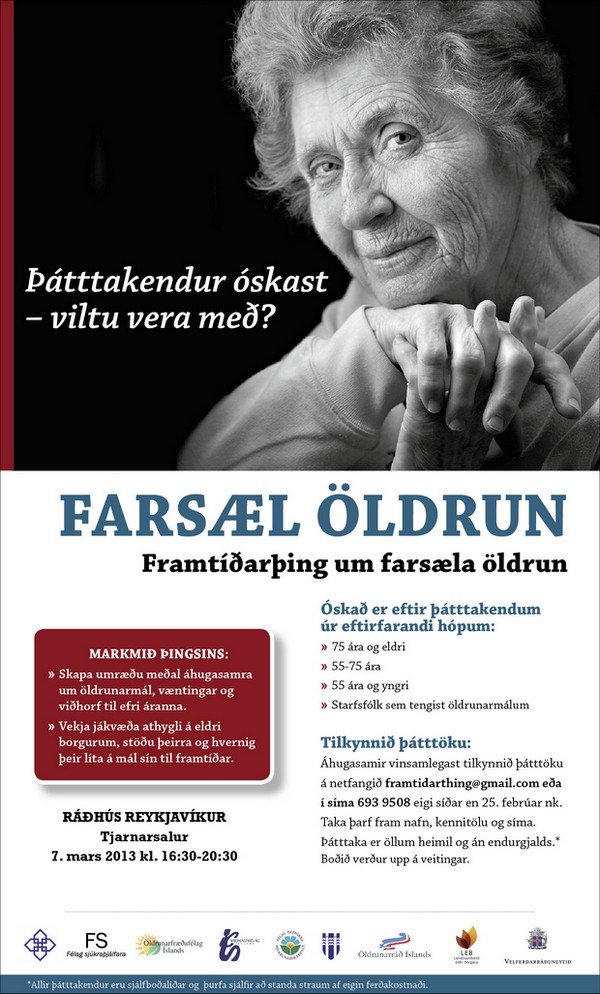 Þann 7. mars næstkomandi fer fram framtíðarþing um farsæla öldrun og er óskað eftir þátttakendum á þingið. Áhugasamir vinsamlegast tilkynnið þátttöku á netfangið framtidarthing@gmail.com eða í síma 693 9508 eigi síðar en 25. febrúar nk. Taka þarf fram nafn, kennitölu og síma. Þátttaka er öllum heimil og án endurgjalds. Boðið verður upp á veitingar.