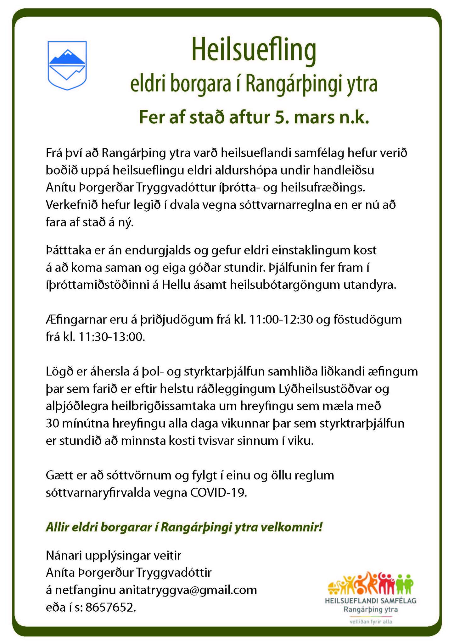 Þátttaka er án endurgjalds og gefur eldri einstaklingum kost á að koma saman og eiga góðar stundir undir handleiðslu Anítu Þorgerðar Tryggvadóttur íþrótta- og heilsufræðings.