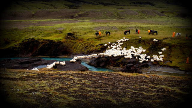 Frá fjárleitum á Rangárvallaafrétti. Fé rekið yfir brú á Markarfljóti við Krók. Ljósmynd/Guðmundur Árnason