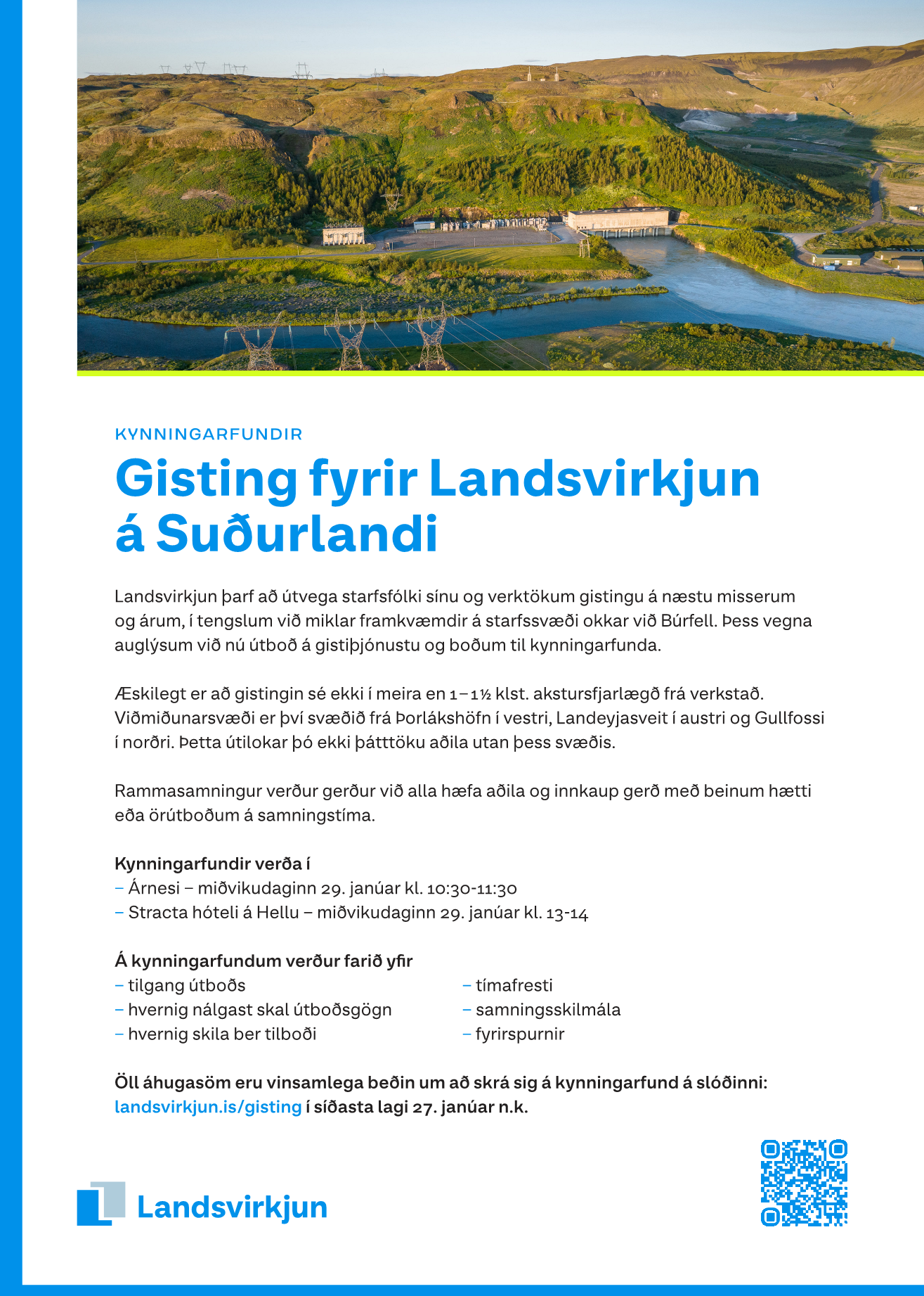 Landsvirkjun þarf að útvega starfsfólki sínu og verktökum gistingu á næstu misserum og árum, í tengslum við miklar framkvæmdir á starfssvæði fyrirtækisins við Búrfell. Þess vegna auglýsir Landsvirkjun nú útboð á gistiþjónustu og boðar til kynningarfunda: