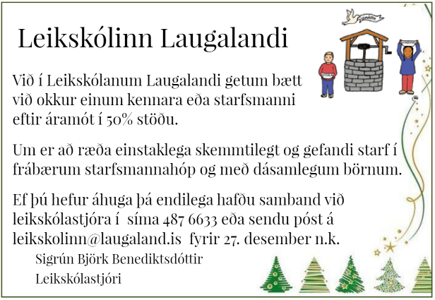 Leikskólinn Laugalandi leitar að kennara eða starfsmanni í 50% stöðu eftir áramót.