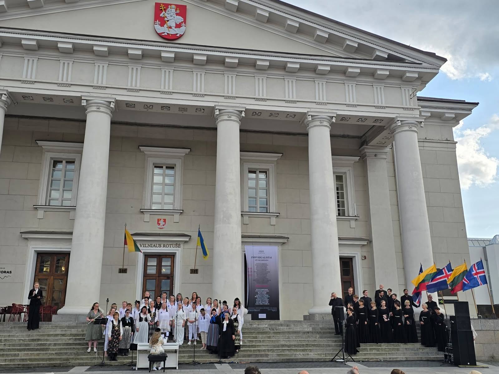 Það yljaði okkur um hjartað að mæta í ráðhúsið þennan dag. Þjóðfánum Íslands og Litháen var flaggað ásamt fána Vilnius og íslensk tónlist spiluð á torginu fyrir alla sem þar áttu leið, bæði fyrir og eftir tónleikana. Tekið var á móti okkur af mikilli virðingu. Kórarnir sungu til skiptis og enduðu báðir kórar á að syngja þjóðsöngva sinnar þjóðar. Kynnirinn talaði meðal annars um þakklætið sem litháíska þjóðin ber til Íslendinga og átti það vel við þennan dag þegar við fögnuðum sjálfstæði Íslendinga en ekki síður mikilvægt á þessum tímum óróleika í heiminum að muna mikilvægi sjálfstæðis þjóða, kærleika og gagnkvæmrar virðingar við náungann.