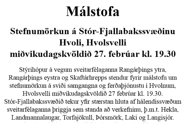 Stýrihópur á vegum sveitarfélaganna Rangárþings ytra, Rangárþings eystra og Skaftárhrepps stendur fyrir málstofu um stefnumörkun á sviði samgangna og ferðaþjónustu í Hvolnum, Hvolsvelli miðvikudagskvöldið 27 febrúar kl. 19.30.