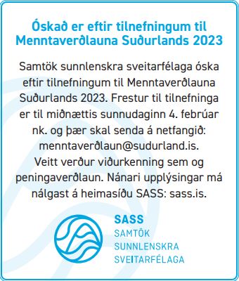 SASS óskar eftir tilnefningum til Menntaverðlauna Suðurlands 2023. Allir þeir sem tengjast skóla- og/eða menntunarstarfi með einhverjum hætti, s.s. sveitarfélög, skólanefndir, kennarar, starfsfólk skóla og annað áhugafólk um menntun og skólastarf, hafa rétt til þess að tilnefna til verðlaunanna. Tilnefningunni verður að fylgja ítarlegur rökstuðningur.