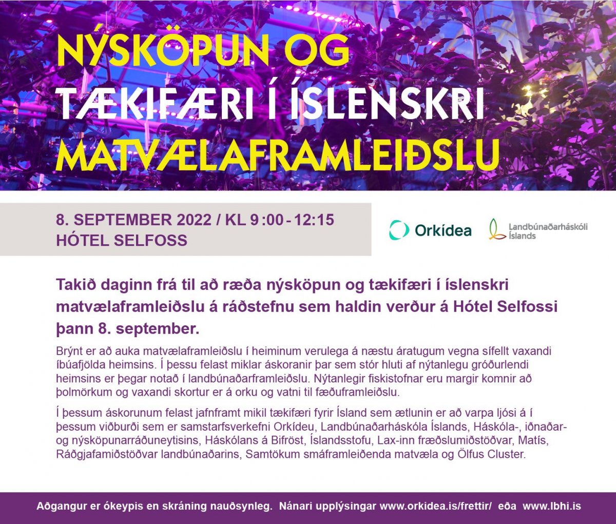 Þann 8. september næstkomandi verður haldin ráðstefna þar sem rætt verður um nýsköpun og tækifæri í íslenskri matvælaframleiðslu á Hótel Selfossi frá kl. 9:00-12:15.