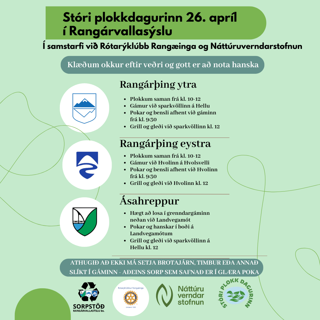 Hægt verður að nálgast glæra poka og bensli við sparkvöllinn á Hellu frá kl. 9:30 á plokkdeginum og í söluskálanum á Landvegamótum verður einnig hægt að fá hanska og poka.