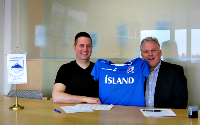 Jón Þorberg Steindórsson starfandi formaður Knattspyrnufélags Rangæinga og Ágúst Sigurðsson sveitarstjóri Rangárþings ytra við undirritun samningsins. Viðeigandi þótti að vera með æfingatreyju frá Dagnýju Brynjarsdóttur landsliðskonu í fótbolta á mynd þar sem hún er ein af þremur landsliðskonum Íslands í knattspyrnu sem hófu feril sinn hjá KFR.