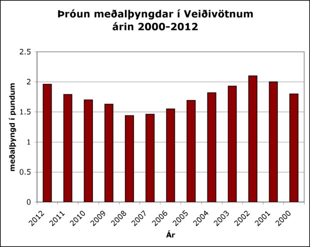 Hér má sjá þróun meðalþyngdar í Veiðivötnum árin 200-2012: