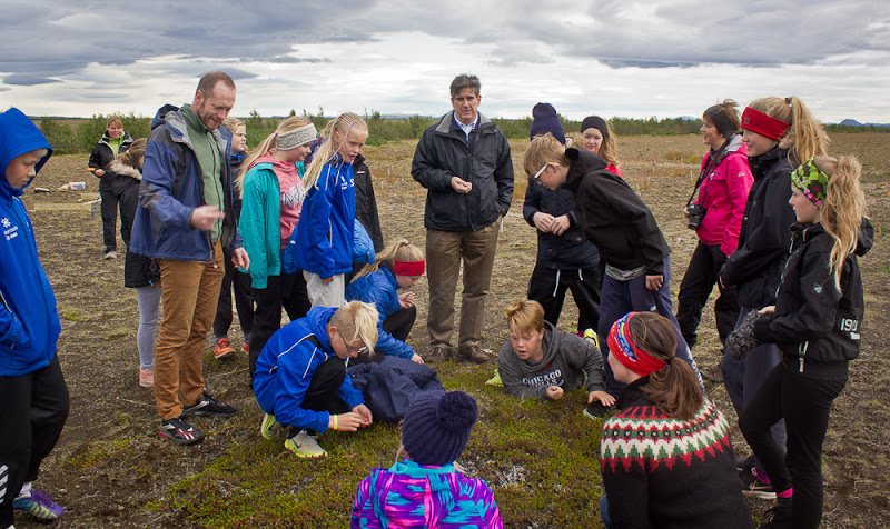 Bandaríski sendiherrann á Íslandi Mr Robert Barber heimsótti Helluskóla í dag til þess m.a. að kynna sér stórmerkilegt verkefni sem nemendur skólans vinna með Landvernd og Landgræðslunni. Um er að ræða verkefni í vistheimt en nemendur 7. bekkjar mældu í dag í annað sinn gróðurþekju í tilraunareitunum sem þau lögðu út vorið 2014. Sendiherrann sýndi þessari vinnu nemenda mikinn áhuga og á heimasíðu skólans kemur fram að nemendur hafi verið duglegir að leiðbeina honum við hvernig vísindamenn bera sig að við mælingar á gróðurþekju. Sjá einnig frétt á RUV