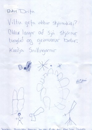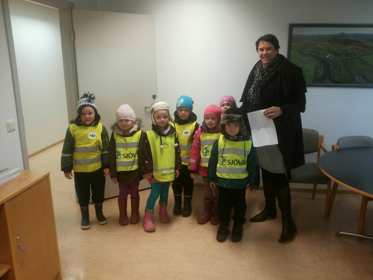 Hópur af skemmtilegum krökkum frá Heklukoti kom í dag ásamt leikskólakennaranum Sigdísi Oddsdóttur til að leggja inn beiðni um að fá stjörnukíki að gjöf frá sveitarfélaginu. Drífa Hjartardóttir sveitarstjóri tók við beiðninni fyrir hönd sveitarfélagsins. Hér fyrir neðan má sjá afrit af beiðninni sem var afhent með formlegum hætti.