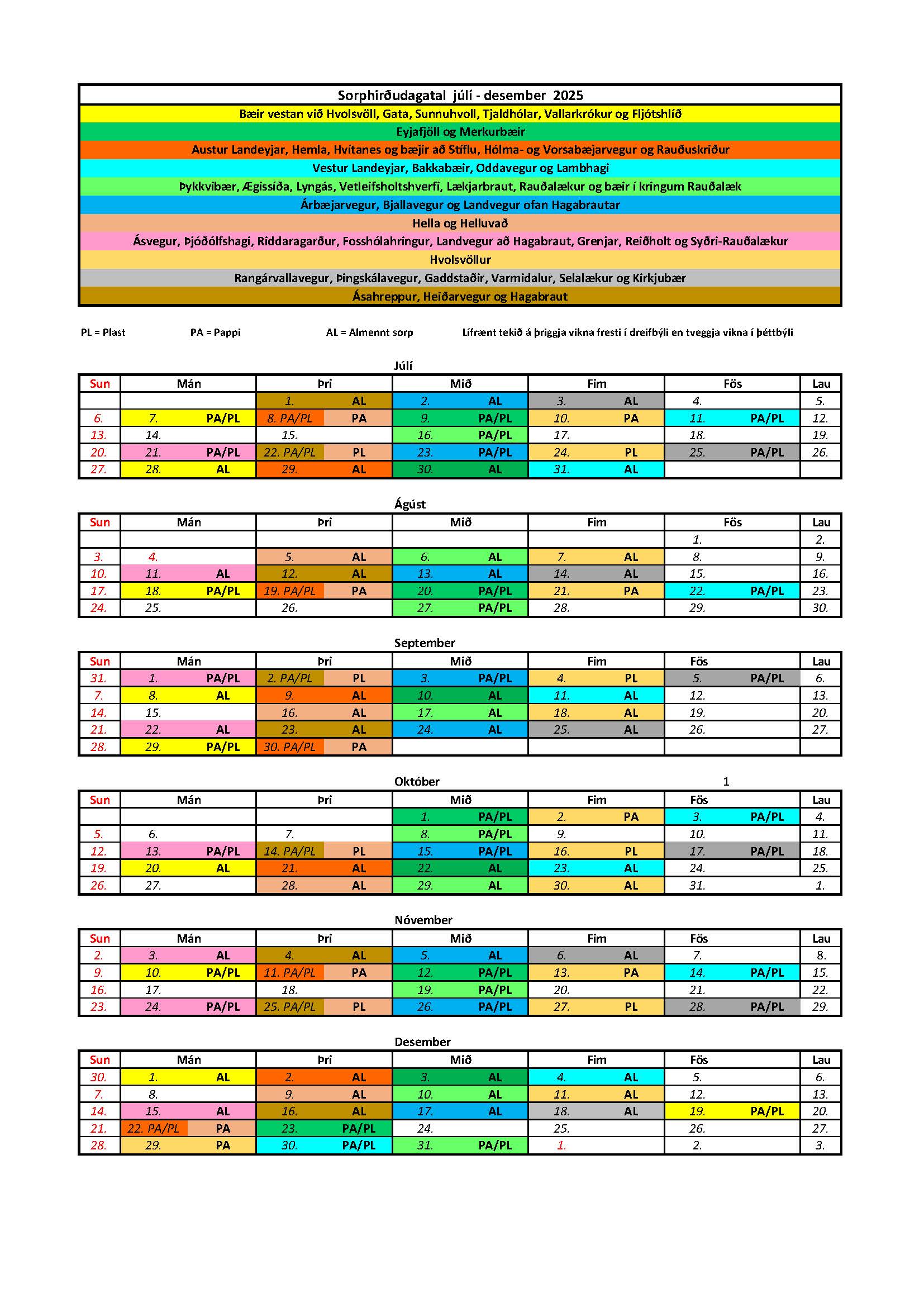 Sorphirðudagatalið fyrir júlí til desember 2025 er tilbúið. Hægt er að skoða það hér fyrir neðan og það er alltaf efst á facebook-síðu Sorpstöðvarinnar. Einnig er tengill hér á pdf-skjal sem hægt er að sækja og prenta út.