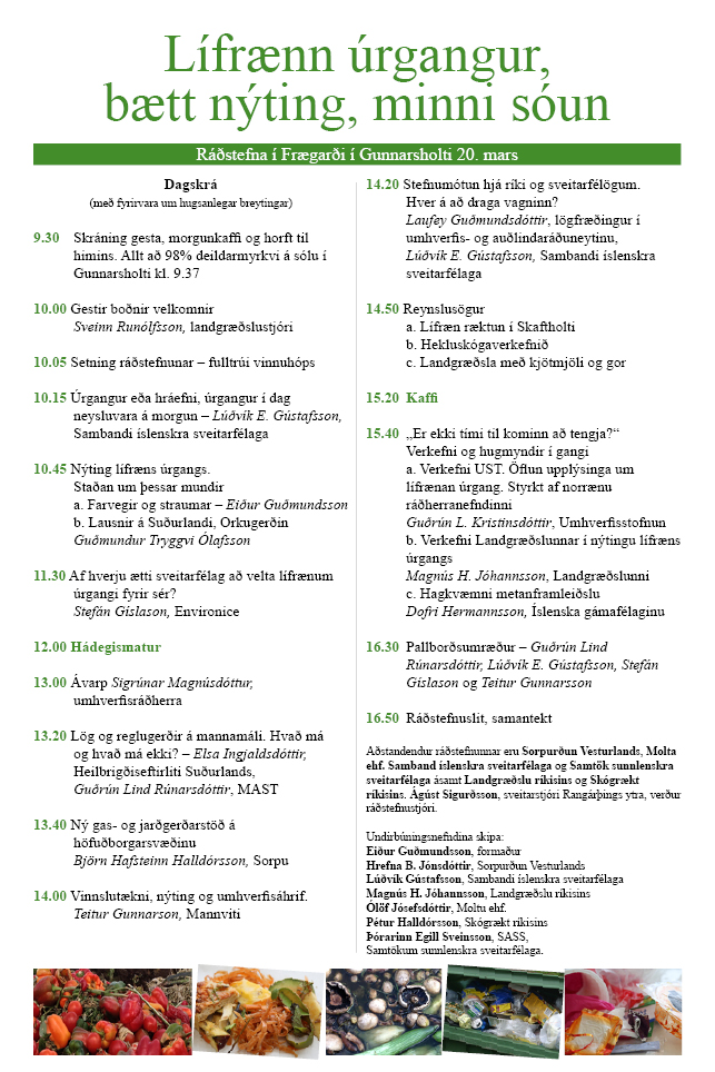 Ráðstefnan verður haldin í Gunnarsholti á Rangárvöllum 20. mars og þar verður fjallað vítt og breitt um lífrænan úrgang en ekki síst um möguleika til nýtingar hans, meðal annars til landgræðslu, skógræktar og annarrar ræktunar. Að ráðstefnunni standa Sorpurðun Vesturlands, Molta ehf., Samband íslenskra sveitarfélag og Samtök sunnlenskra sveitarfélaga ásamt Landgræðslu ríkisins og Skógrækt ríkisins. Ágúst Sigurðsson, sveitarstjóri Rangárþings ytra, verður ráðstefnustjóri.