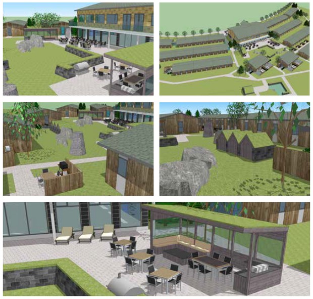 Grunnhönnun hótelsins er í ætt við "Herragarðsstíl". Þannig tekur á móti gestum stórt og reisulegt hús þegar komið er á staðinn. Gistingin er öll í húsum sem eru á einni hæð, flest tengd aðalbyggingunni með glergöngum. Byggingarnar umlykja hótelgarð sem rammaður er inn af gistieiningum hótelsins en honum er ætlað að vera afdrep til afþreyingar og hvíldar. Rúmgóð útisvæði verða sett upp þar sem gestir geta setið og notið morgun- og kvöldsólar. Nokkrir heitir pottar verða á hverjum stað, útigrill og leiksvæði fyrir börn.