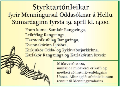 Þau félög sem starfa í Menningarsalnum á Hellu og hafa þar aðstöðu munu á sumardaginn fyrsta kl. 14:00 halda styrktartónleika fyrir salinn. Þar koma fram Samkór Rangæinga, Leikfélag Rangæinga, Harmonikufélag Rangæinga, Kvennakórinn Ljósbrá, Kirkjukór Odda- og Þykkvabæjarkirkna, Karlakór Rangæinga og Karlakórinn Þrestir.