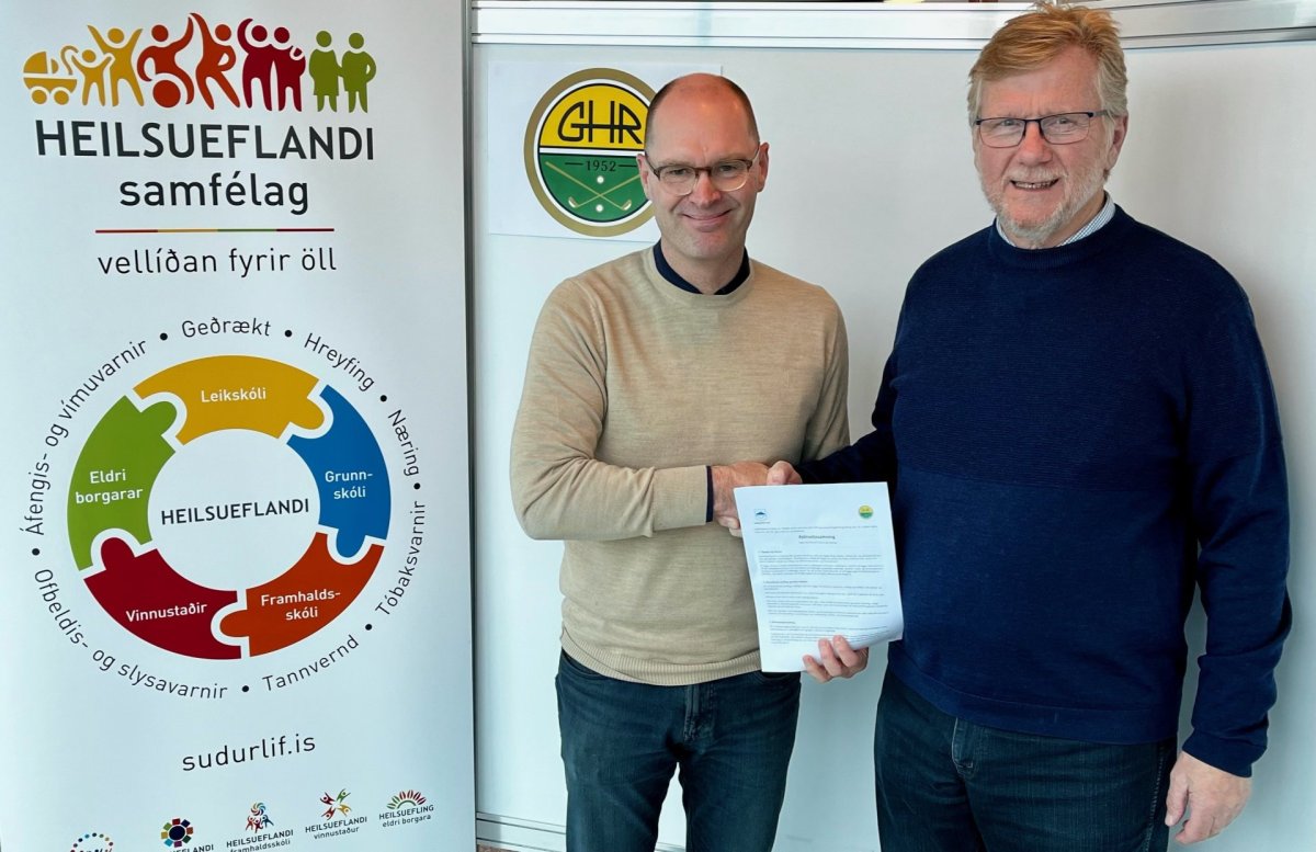 Jón Valgeirsson, sveitarstjóri RY og Guðmundur Ágúst Ingvarsson, formaður GHR handsala samninginn.