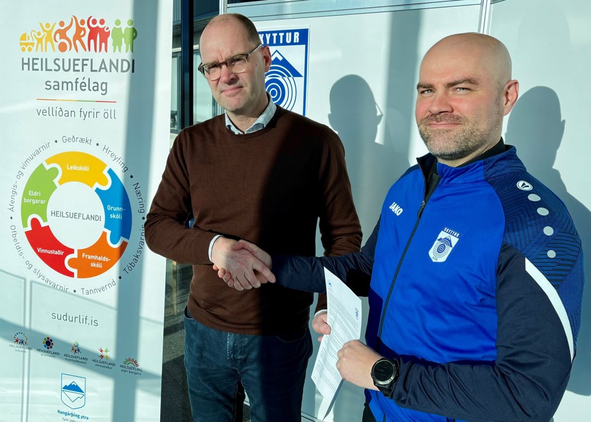 Jón Valgeirsson, sveitarstjóri RY og Magnús Ragnarsson, formaður Skotíþróttafélagsins Skyttur handsala samninginn.