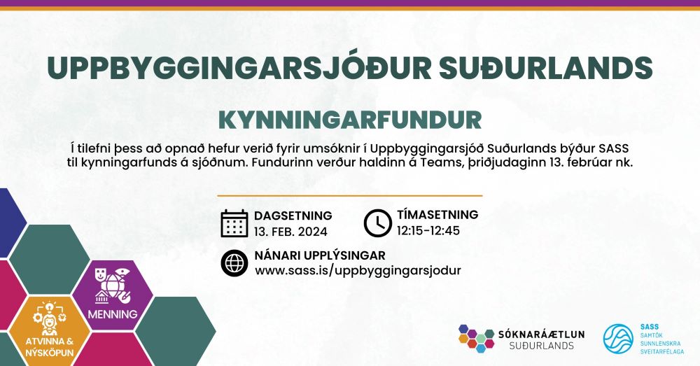 Nú er hægt að sækja um í sjóðinn fyrir vorúthlutun 2024. Kynningarfundur verður haldinn á Teams 13. febrúar kl. 12:15 og umsóknarfrestur er til 5. mars.